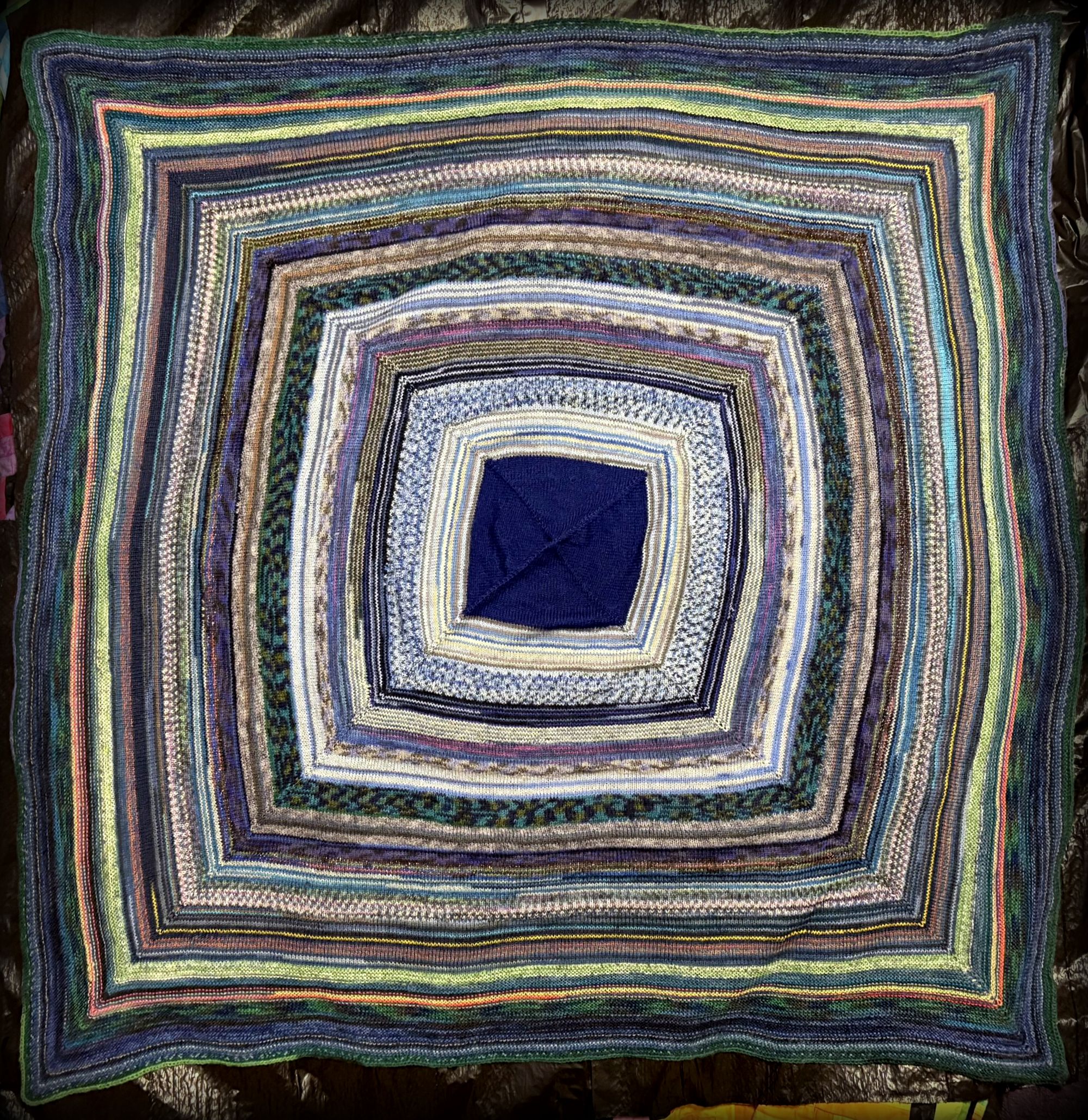 My completed Giant Square Scrap Blanket, made with many bits of leftover sock yarn (all with at least some blue) and knitted on 3mm needles (US 2.5). This was a gift and it was much appreciated. Which is good, because by the end, I was using 150 inches of circular needle cable and I could’ve added more… No idea how many stitches I ended up with, but it’s about 3.5-4 feet across. Used two-stitch i-cord to bind it off.